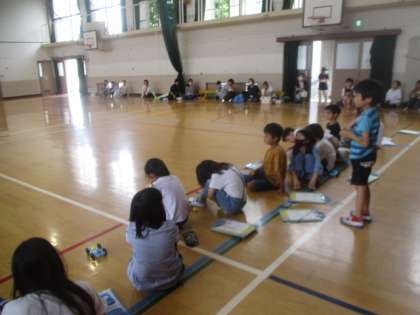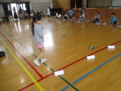 土曜参観のラストは理科の学習でした。今日は体育館に行って、車を走らせながらゴムを引っぱる長さと車が走る距離の関係について検証しました。10cmと15cmでは、やはり15cmの方が車が遠くまで走るということを確かめることができました。授業終盤では、同じ15cmの引っ張りでさらに車を遠くまで走らせるにはということも考え、次回以降につながる時間になりました。