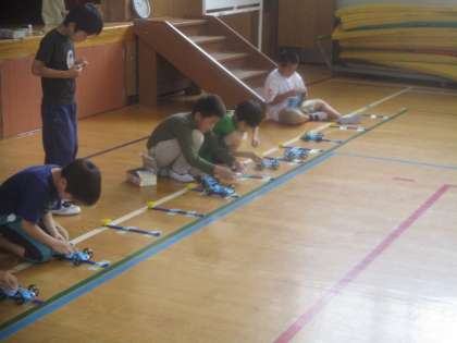 先日の土曜参観の際に、実験した車を同じ15cmの引っ張りでより遠くまで走らせるには、ゴムにどのような工夫ができるのかということで今日も体育館で車を走らせました。ゴムの本数や太さ、長さ、ねじりなど様々な工夫を凝らすことで、前回より5m以上も走行距離が伸びた車もありました。次の時間には、今回の工夫をみんなで共有して、学習をさらに進めていきたいと思います。