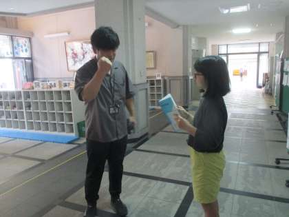 国語科の「みんなが過ごしやすい町へ」という単元の学習で身の回りの工夫について調べる学習を行っています。調べる手段としては、本やインターネット、インタビュー、アンケートなど、様々な手段から適切なものを選択し子どもたちは調べ学習に意欲的に取り組むことができています。インタビューで調べようとしている子どもたちは、長年この学校で仕事をされている教頭先生や他学年の先生に学校にある工夫について尋ねてみたいと、ワクワクした様子でインタビューに向かっていました。