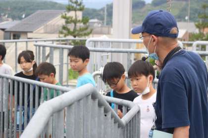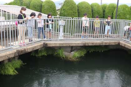 子どもたちの色んな気づきがあった、見学最初の場所。それは「着水井」でした。疎水から通ってきた原水が最初にたどり着く池なので、子どもたちが言うように疎水を流れている水と変わらないのですね。この水が本当に飲み水になるのかと素直に思う子どもたちでした。