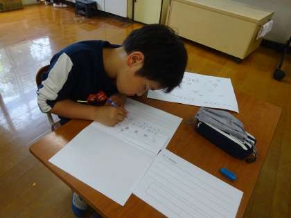 お手本を横に並べて、字の形や文章の中心に気をつけながら、集中して丁寧に書こうとしていました。