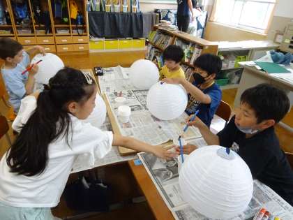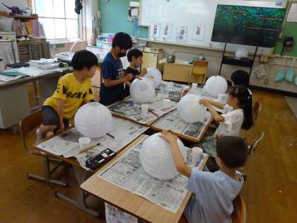 白い、丸い、ランタンに、薄い絵の具で色をつけました。