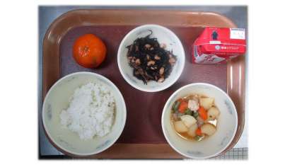 今日の給食は、 ごはん 牛乳 鶏肉と野菜の煮つけ ひじき豆 みかん です。