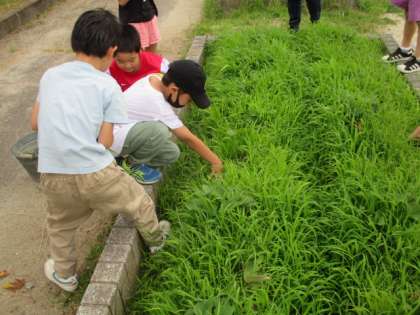 雑草を抜いていると小さな生き物がたくさん見つかりました。これも生活科の「小さな 友だち」の学習につながりますね。2年生には「虫博士」がいて、「この虫の名まえは?」と聞くと、なんでも答えてくれます。すごいですね。私も全然虫のことは詳しくないので、どんどん聞いてかしこくなろうと思います。