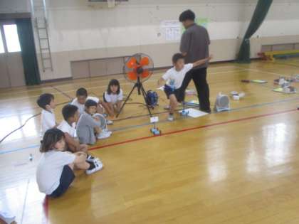 理科の学習では、子どもたちが大好きな体育館での走行実験を行いました。送風機を使って風の力を確かめる実験を行いました。風の強度によって車の走行距離に変化が出るという予想は、ずばり的中しており、最後に大型扇風機を使って、より強い風を当てると車はぐんぐん前進し、体育館の端まで走りました。みんなで楽しみながらもしっかりと風の力を確かめることができました。