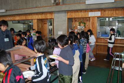 バイキング形式の昼食を食べています。学校で学習したように栄養のバランスを考えて食べ物を選んでいました。木のテーブルと椅子が落ち着いた気持ちにしてくれます。