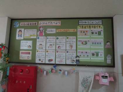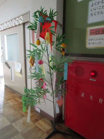 1年生に七夕飾りで「給食にでてほしい献立」か「食べられるようになりたいもの」を書いてもらいました。願い事が叶いますように。