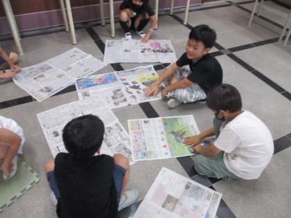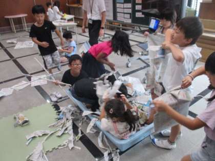 大きな教室で、自由に遊べる授業は、なかなかないので、みんなとても楽しそうに活動していました。新聞紙っていろんな使い方、遊び方ができるんですね。