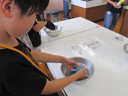 洗濯の基本的な手順や方法を確認し、靴下を手洗いで洗濯しました。電気洗濯機のありがたさを感じながら、もみ洗いやつまみ洗いで洗い、すすいでしぼり、干すところまで実践しました。夏を快適に過ごすために、衣服の着方や手入れを工夫していってほしいと思います。