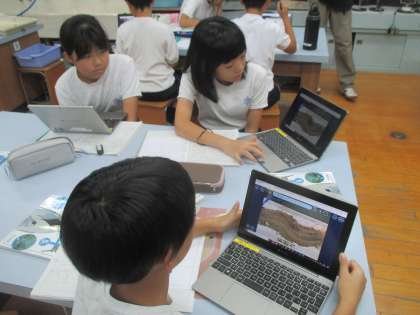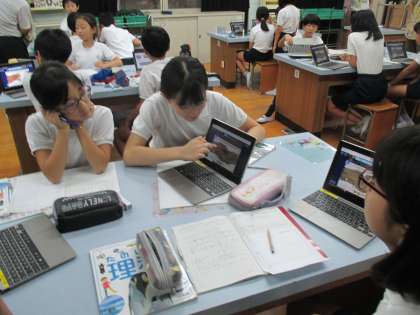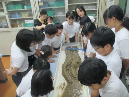 流れる水にはどのような働きがあるのか、水の量によって違いがあるのかを実験で確かめました。実験前にはロイロノートで写真に書き込んだものを使って予想を立て、交流をしました。川に見立てた実験道具に水を流し、川の底が削られること、水の量によって運ばれる石の大きさが違うこと、運ばれたものが積もることを確かめることができました。
