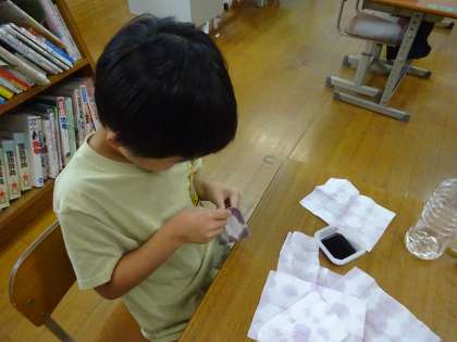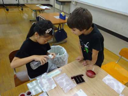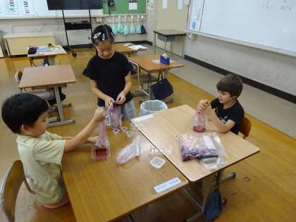 4年生は、ブルーベリーで作った色水に、レモンや重曹を溶かした水を混ぜて、色の変化を観察しました。