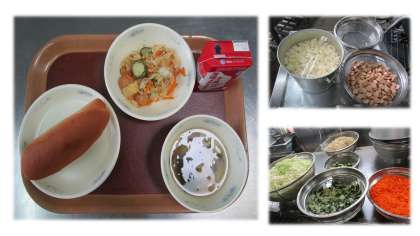 今日の給食は コッペパン(国内産小麦100%) ソーセージと野菜のいためナムル スープです。