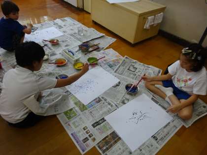 普段なら注意される「筆を振って絵の具を飛ばす」活動に、「いいの?」とためらいながら始めましたが、だんだん勢いがついて、面白い模様ができました。