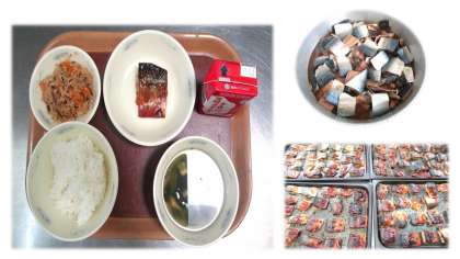さばのつけ焼きは、さばにしょうが・三温糖・みりん・料理酒・しょうゆをつけこんで、スチコンで焼きました。