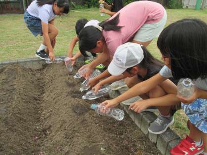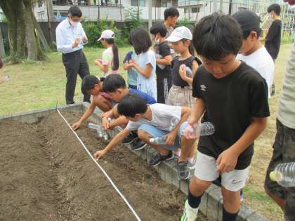 食育授業で、さまざまな野菜のことについて学びました。野菜と果物の違いについてお話をしていただいたり、普段食べている野菜はどの部分を食べているのかといったことなどについて教えていただいたりしました。その後、花壇に大根の種をまきました。授業をしてくださった先生は、「植物も生き物だ」とおっしゃっていました。小さな小さな種から大きな大きな大根ができるなんて、本当に生き物の力はすごいですね。