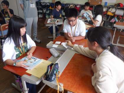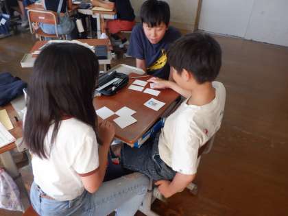 What did you do in summer? や Hou was it? という表現を使って、友達とゲームやインタビュー活動をしました。感想を伝える表現を積極的に使いました。