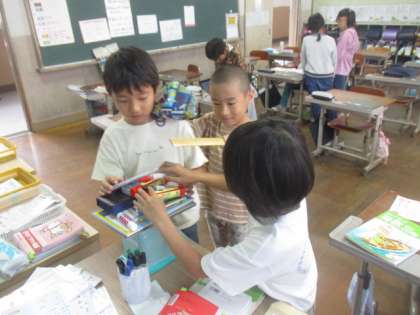 今日は、2kgまではかることができるはかりを用いて、1000g(1kg)をこえる重さの物をはかりました。これまでに使用していた1kgまでのはかりの時とはちがうめもりを見て、間違えないようにしっかりと重さをはかっていました。はかりから1000g=1kgと気づけたときの学級全体に漂ったなるほどという雰囲気とてもよかったです。