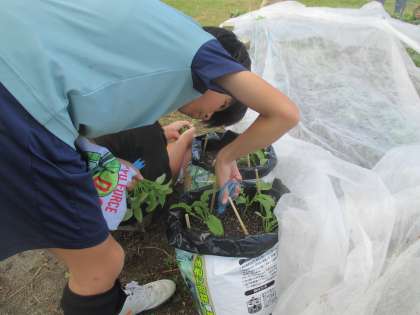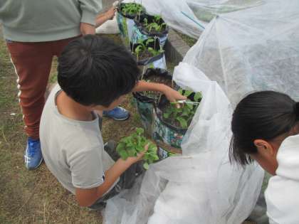 今日は、袋で栽培している大根の間引きを行いました。3連休をはさみ、3日ぶりに見た大根の葉は、とても立派に成長していました。その中から更に元気に育ちそうな芽を選び、間引き、追肥を行いました。これからの成長がとても楽しみです。
