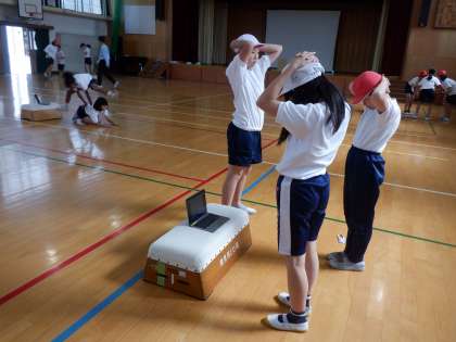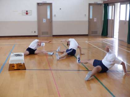 自分たちの体力を高めるために、オリジナルの体操(パワーアップ体操)を考えて、実践しています。体の巧みさと柔らかさを高められるように、グループで話し合って進めています。子どもたちからは「楽しい!」という声が聞こえてきました。体力をただ高めるだけでなく、楽しさも大切にしていきたいです。