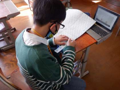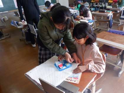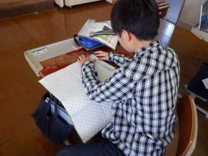 家庭科の授業でトートバッグを作ります。ぬいしろを決めたり、しつけぬいをしたりしました。集中して進める中、友達にアドバイスする姿も見られました。協力し合ってがんばっています。