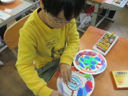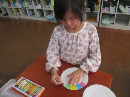 紙皿をまわしてきれいな模様に見えるように、色の塗り方や模様の描き方を工夫しています。丁寧に塗ったり、色の組み合わせを考えたりと楽しみながら工夫することができていました。