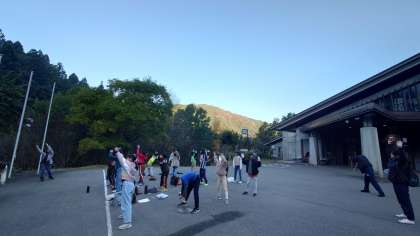 雲ひとつない爽やかな朝、子どもたちはぐっすり寝られたようで、朝から元気いっぱいです。朝の集いではラジオ体操「津軽版」で体を動かしました。このあと朝食をいただき、午前中の活動クライミングにチャレンジします。今日の目標は「自然」と「協力」です。