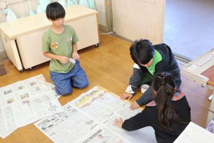 算数科で面積について学んでいる子どもたち。理論的にはどれくらいが1平方メートルなのかはわかっていますが、やはり量感は具体物にふれて磨くもの。今回は新聞紙で1平方メートルを作ってみました。1辺が1mという長さであることを生かして、子どもたちはグループで協力して作っていきました。