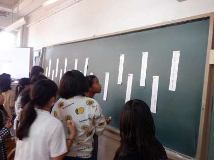 1人ずつおすすめの俳句を黒板に掲示して、みんなで読み合いました。「いいな」と思った俳句にシールをはりました。個性あふれる俳句ばかりでおもしろかったです。最後に、先生から、1句ずつすべての作品について褒めていただきました。