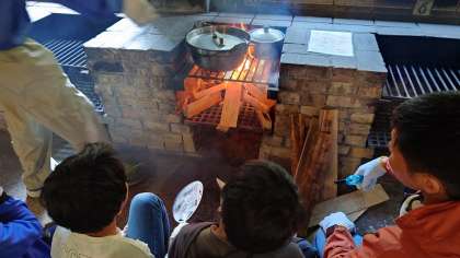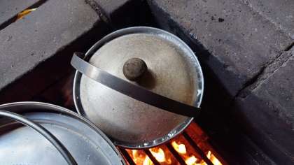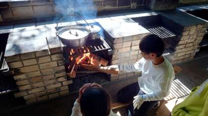 火の勢いを調整するのが難しいですね。空気の通り道を考えながら、薪を入れていきましょう。ご飯がぐつぐつふき始めたグループも出てきました。もう少しです。