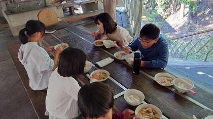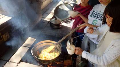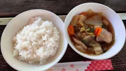 いよいよ鍋もグツグツ煮込まれ、鶏すき焼き風煮の出来上がりです。ご飯もふっくら炊きあがりました。