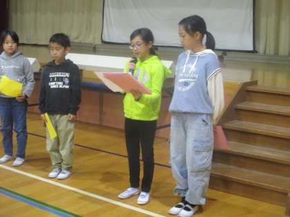 今日は、にこにこ集会がありました。人権学習のふり返りでは、代表の児童2人が10月に行ったイヤーマフや補聴器を使った疑似体験をして感じたことや考えたことを堂々と発表することができました。