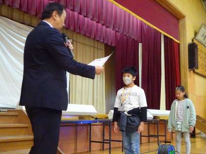 全校の前で、校長先生に賞状をもらいました。
