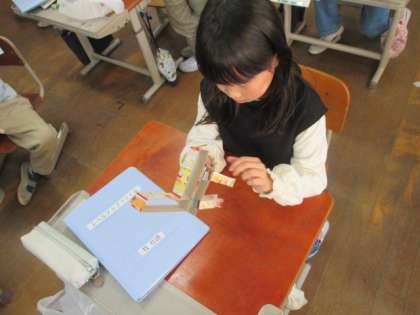 国語科「馬のおもちゃの作り方」の学習では、実際に教科書に載っている本文や挿絵をもとに馬のおもちゃをつくる活動に入りました。はじめこそ「分からへんっ!!」「どうするのっ!」と言っていた子どもたちですが、丁寧に文章を読み進める中でポイントに気付きながら、作成を進めることができました。