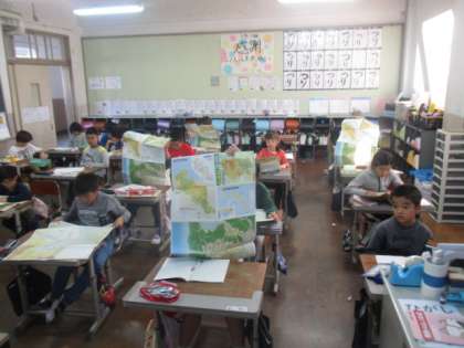社会科の学習では、大きな京都市の地図を広げて、学習している岩倉や岡崎がどのあたりなのかを確認しました。どちらも養正小学校から近い場所に位置していて子どもたちにとって学びやすかったのではないかと思います。特に岡崎のエリアでは平安神宮などもあり、行ったことがあることもあって、盛り上がっていました。