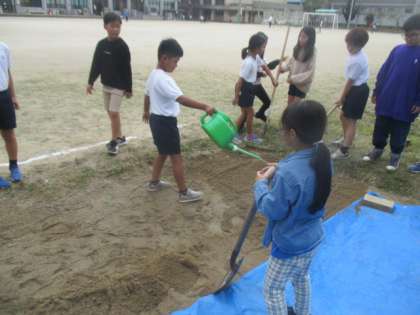 今日は、養正シリーズ第6戦の予定でしたが…あいにくの雨模様。2勝2敗1分で迎えた最終第6戦は、来週に順延となりました。しかし、子どもたちの熱は冷めず、作戦会議に明け暮れていました。最終決戦にふさわしい1戦になりそうです。また、昼休みには、次の単元に向けて、有志のメンバーで砂場をやわらかくしました。飛び込む砂場はフカフカがいいねとみんな張り切って、スコップやレーキでやわらかくしてくれていました。