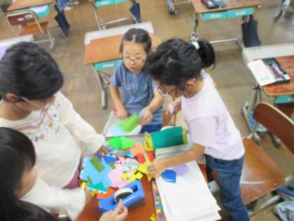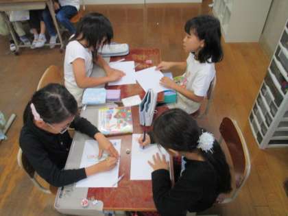 忙しい学習発表会の練習の合間を縫って、係活動にも自発的に取り組んでいます。それぞれの係で、先生から言われたことをするのではなく、活動内容を工夫しながら進めている姿がとても輝いています。「先生、読み聞かせの本をみんなにも募集したいので紙ください!」「飾り係で作った飾りができたので、教室に貼ってもいいですか?」など、子どもたちの意見でいいクラスが出来上がっています。