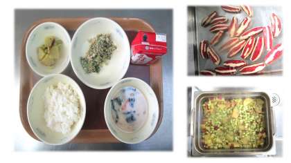 今日の給食は ごはん 牛乳 とりとだいこん葉のまぜごはん(具) さつまいもの栂尾煮 豆乳のみそ汁 です。
