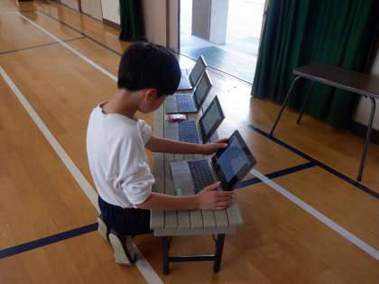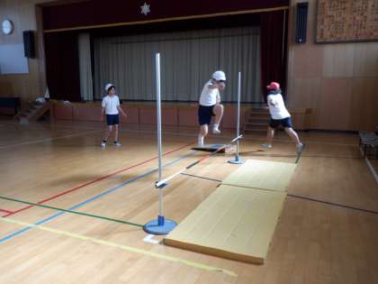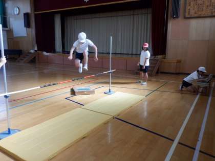 走り高跳びの授業に入りました。1時間目でしたので、踏み切り足や助走のきょりを確かめました。役割分担して、記録を測定していくことができました。