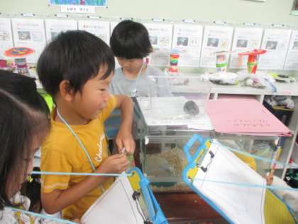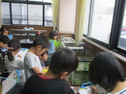 養正小学校でお世話をしている生きものをおうちの人に伝えるために、「知らせたい・見せたいカード」を作っています。今日は自分が知らせたい生き物を観察して、絵と言葉をカードに書きました。ここからどんどん文章にしていきます。