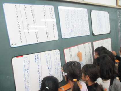 国語科「おもちゃの作り方のせつめいをしよう」では、自分の作りたいおもちゃの説明文を書く活動に移っています。同じおもちゃを作る友達と説明の仕方を考えながら、協力してホワイトボードに意見をまとめています。