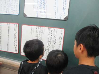 今日は、一度書いた文章を見あって、他のグループの説明で分かりやすいところを探しました。ただ「切ります。」「貼ります。」と説明するのではなく、「まずはロケットになる部分を作ります。」や「ここがまわるしくみになります。」と、教科書の書きぶりをマネしているグループがありました。とても分かりやすい文章構成です。友達の意見も参考に読み手に分かりやすい文章を書き上げる予定です。