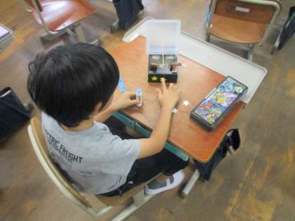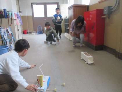生活科「あそんでためしてくふうして」の学習では、「走るおもちゃ」づくりに励んでいます。今日は、実際に床を走らせたり、滑らせたりする中で、よりスムーズに、より遠くへ移動できるおもちゃを作っていきました。