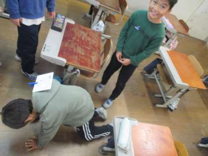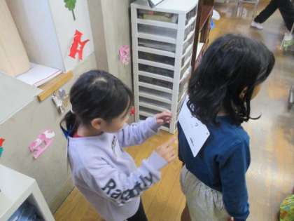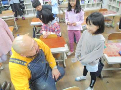「わたしはどれくらいの大きさですか?」「私は何色ですか?」「私の動きを身体であらわしてください。」といろいろな質問が飛び交っていて楽しかったです。子どもたちは、自分と友だちの背中にくっついたカードをヒントに頑張って自分が誰かを当てていました。