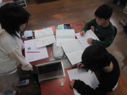 今日はいよいよ自分のつくりたいおもちゃの説明文の清書に入りました。グループのメンバーで話し合って決めた〈作り方〉や〈あそび方〉の文章を基に、写真や絵をはるところも考えながら、書き進めていました。