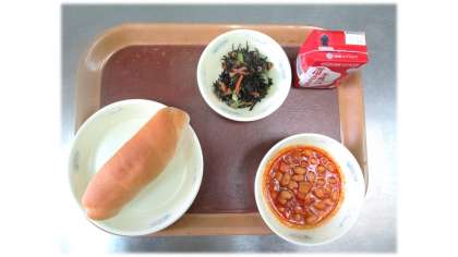 今日の給食は 全粒粉パン ポークビーンズ ツナとひじきのソテー です。