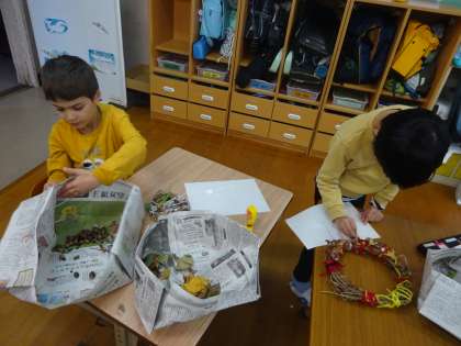 下がもじんじゃで見つけたどんぐりや はっぱで、あさがおのリースをかざりつけしました。