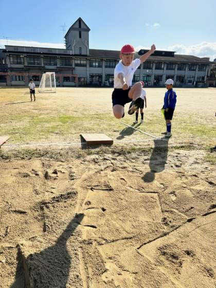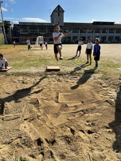 5年生は体育の学習で走り幅跳びの学習を行っています。最初は、ただ遠くを目指して跳んでいるようでしたが、時間を重ねるごとに踏み切りやうでの振り方、目線などについてたくさんの気付きがうまれ、記録を伸ばすために何を意識することが大切なのかを考えながら跳ぶ姿が見られるようになってきました。また、友達どうしでアドバイスをしたり、励まし合ったりする姿も見られ、声をかけられた子どもたちはとてもうれしそうで、次のジャンプに向けて意欲を高めていました。