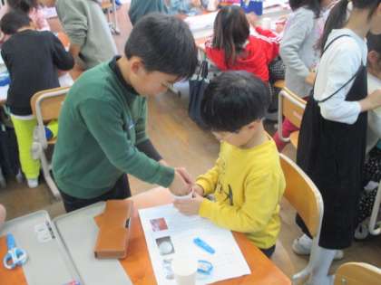 国語科「おもちゃの作り方のせつめいをしよう」を最後の活動として、頑張ってかいた説明文を1年生に読んでもらって、おもちゃを作ってもらう会を設けました。準備の段階から、「これで分かってもらえるかな。」「フリガナ打ちました!」と、相手意識をもって説明文を書いている姿がよく見られました。