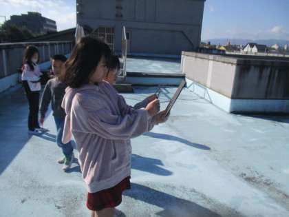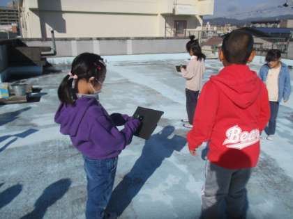 理科の時間には、太陽の力を一点に集中させる実験をしました。黒い画用紙と虫めがねを使って、光を集めることで温度が急激に上昇して煙が出るほど熱くなります。使い方や安全面には十分気をつけながら、太陽の光の力を目の当たりにすることが出来ました。