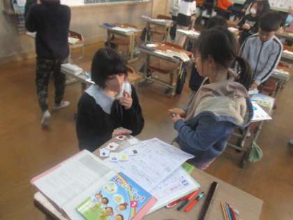 今日はALTの先生と一緒にクリスマスカードの材料集めをしました。What do you want?とI want 〜の表現でほしい形のカードを集めました。作りたいカードをイメージしながら材料を集めました。最後のALTの先生へのチャレンジでは、果敢にチャレンジしてたくさんほめていただきました。